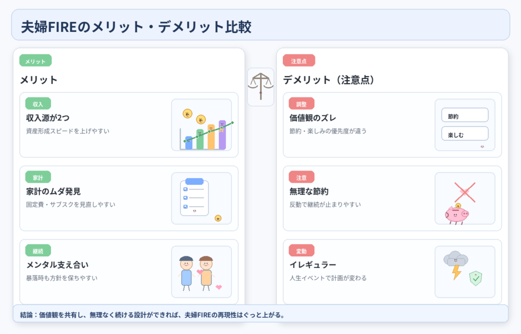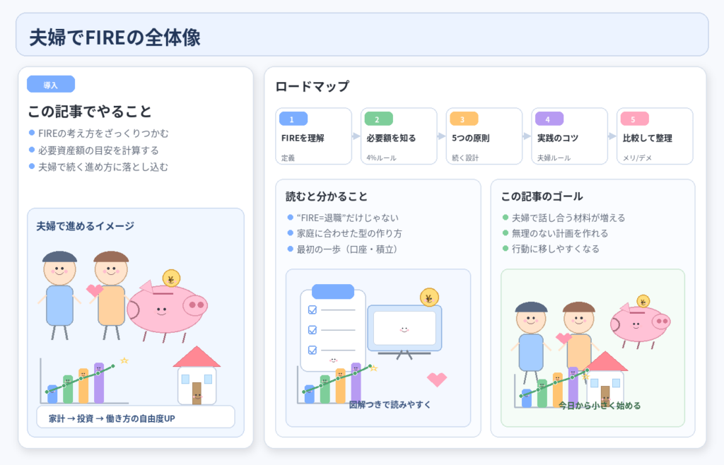 この記事では、夫婦でFIREを目指すうえで大切な5つのことを、メリット・デメリットも含めてわかりやすく解説します。