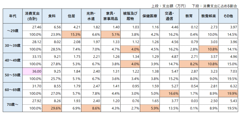 ピンクは最も金額の高い年齢階級、 オレンジは各項目ごとに最も割合の高い年齢階級です。