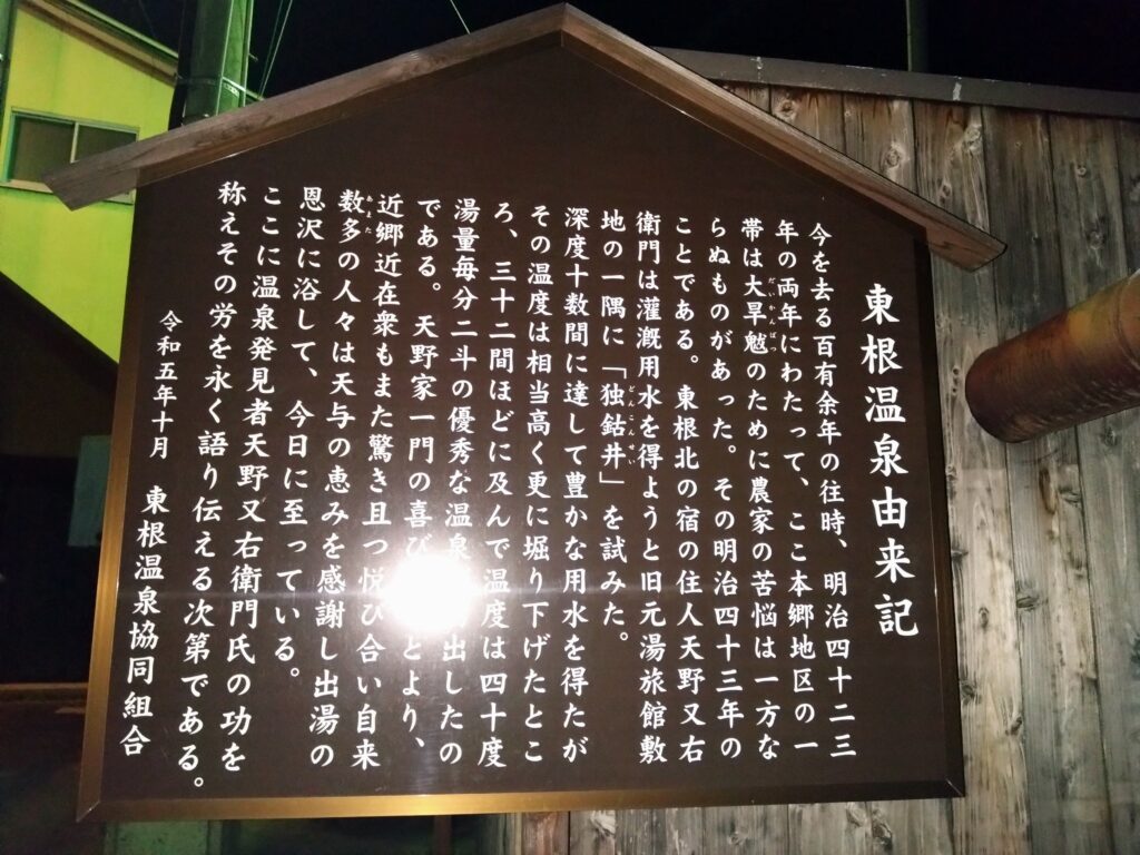 この辺の地域は「東根温泉」と呼ばれているようで、明治四十三年に開湯し、山でもなく海でもない、田園風景の中に湧き出た琥珀色の温泉は、地方の方々から愛されてきたようです。